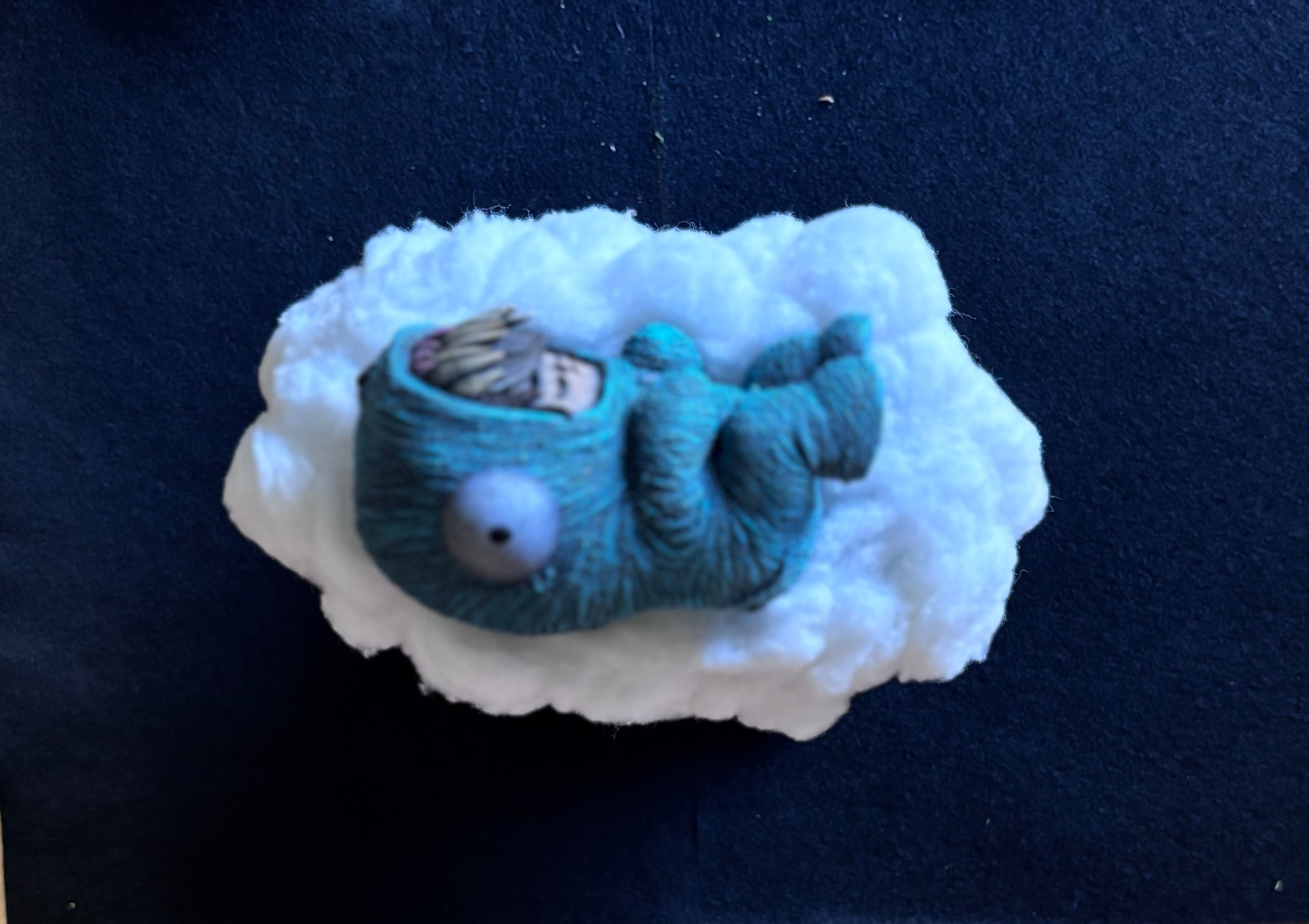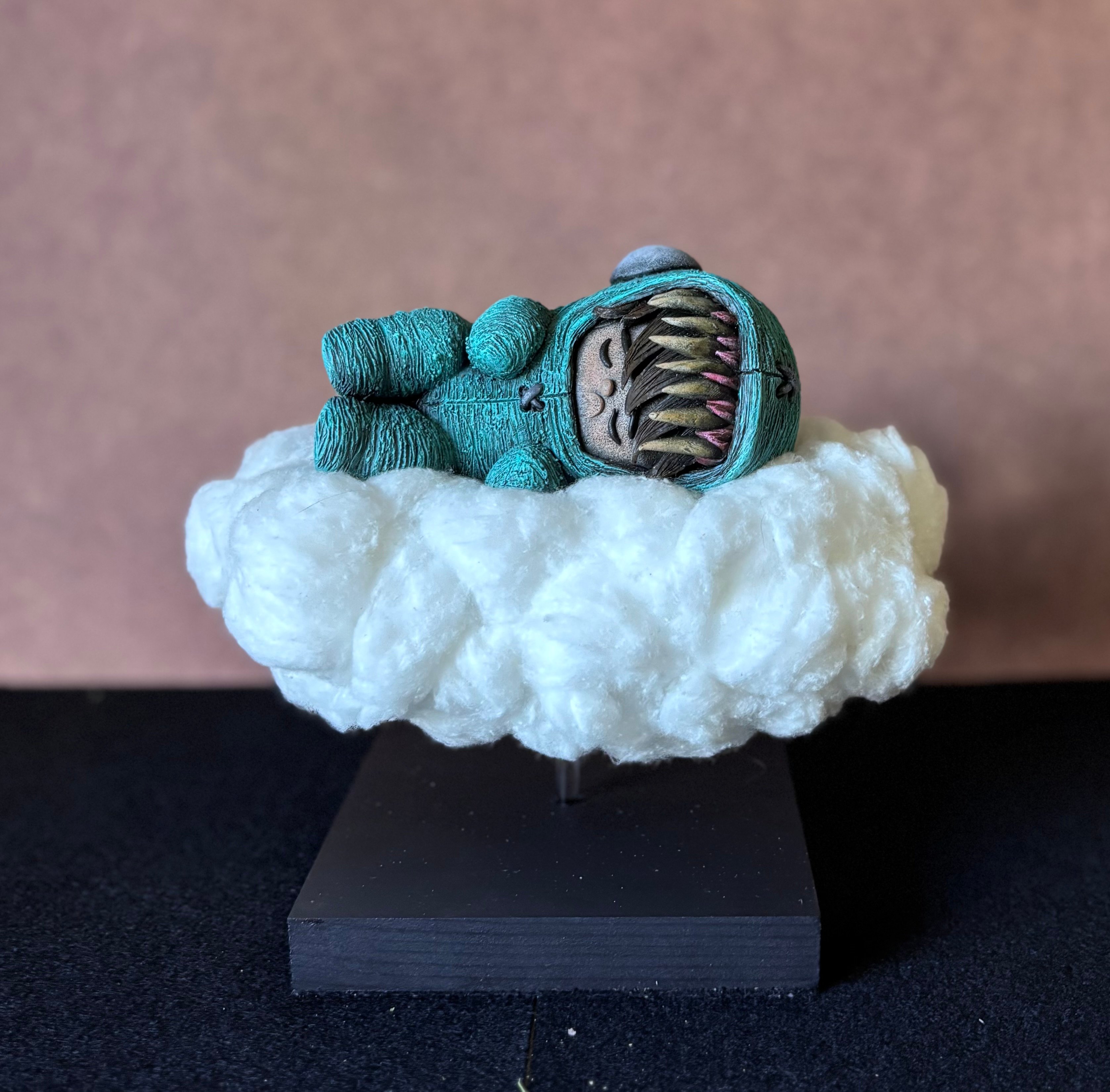 This piece is inspired by constant sleepless nights, paranoia and, hyperactive imagination and the longing for inner peace. $300 9in x 7in Polymer clay, epoxy clay, acrylic, wooden base, foil, cotton