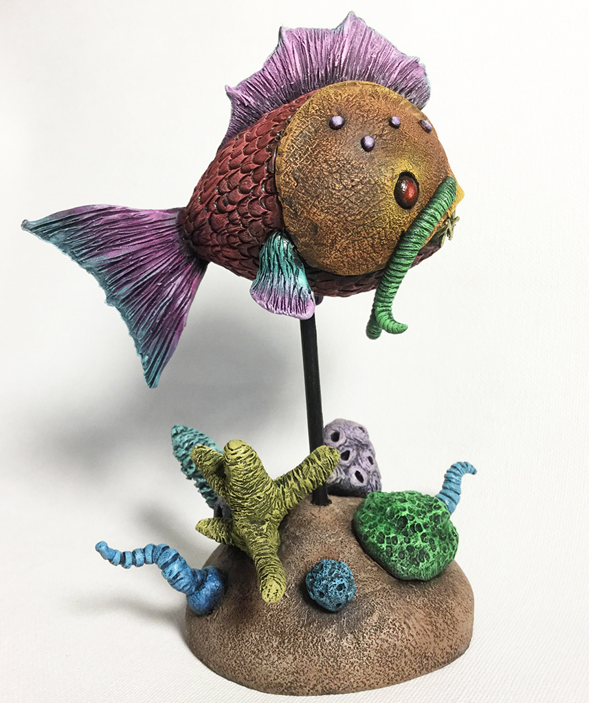 Behold the Drone Fish! Here is the 2nd finished piece of our live sculpting session that was suggested by the viewers from subject to paint. Sculpted from scratch. The base is included with this Fish Drone.
