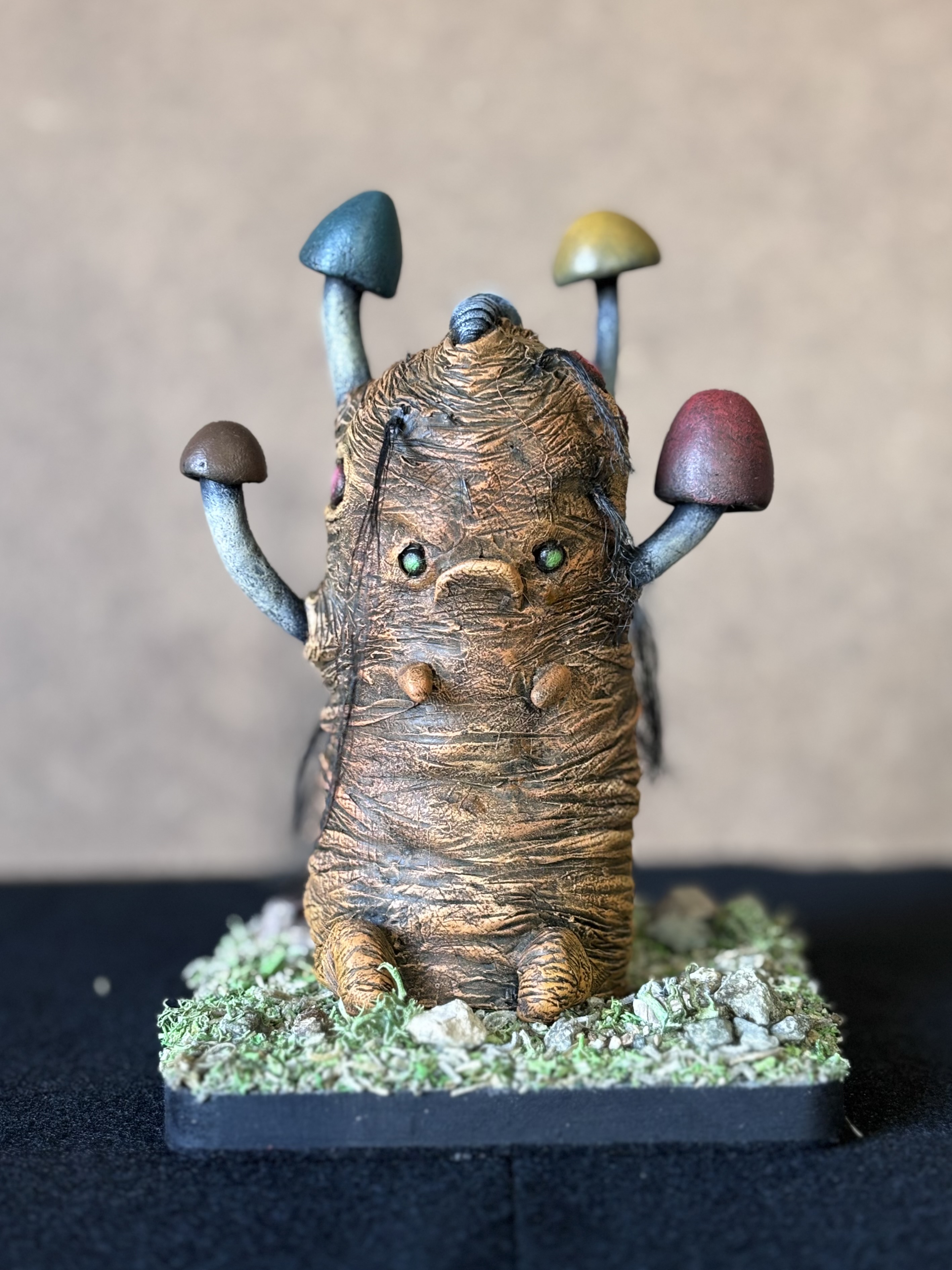 Nibiruan Spore” This piece is inspired by munching on caps & stems (iykyk) $150 5.75in x 4in Polymer clay, epoxy clay, acrylic, wooden base, foil, doll hair