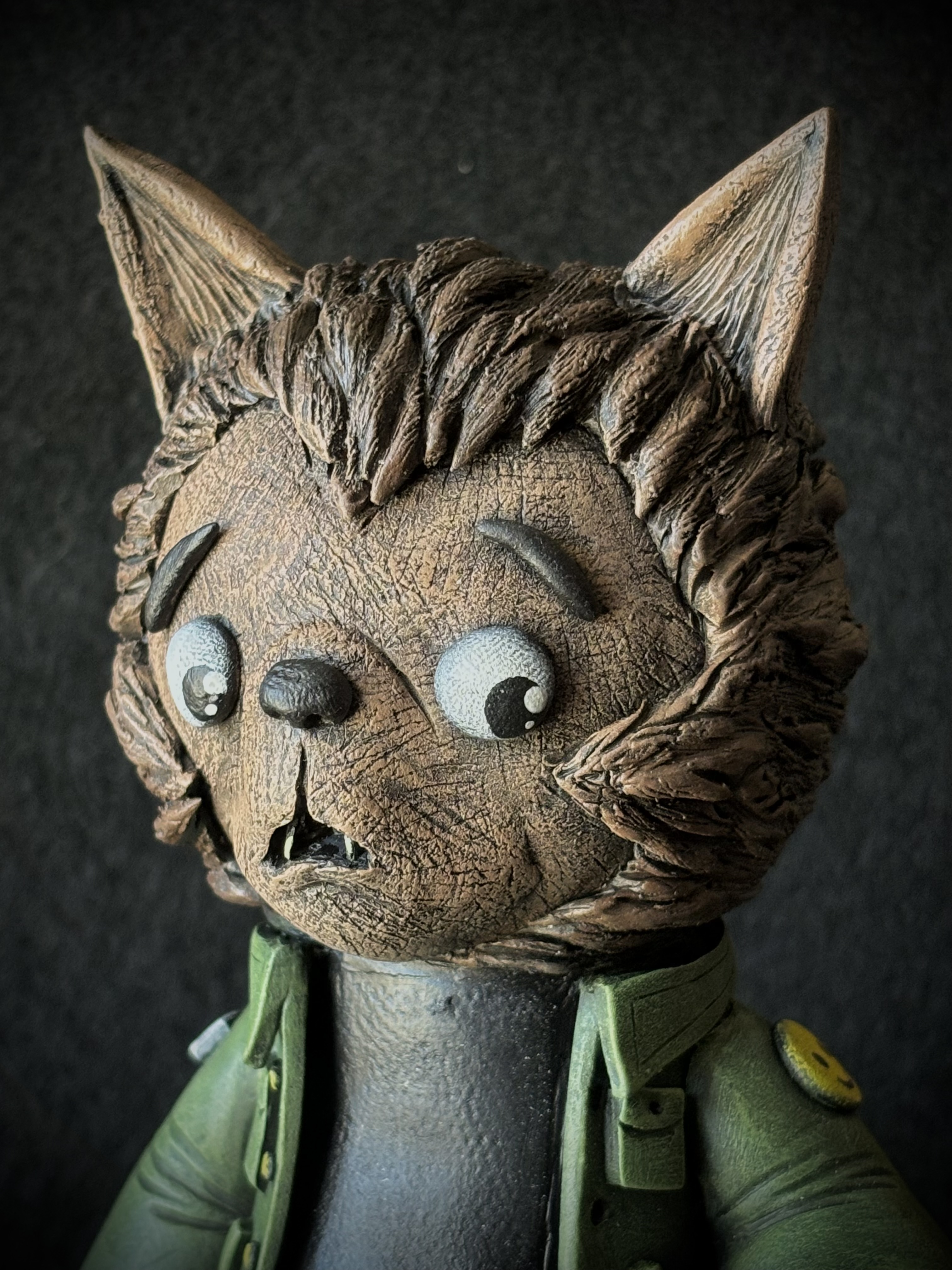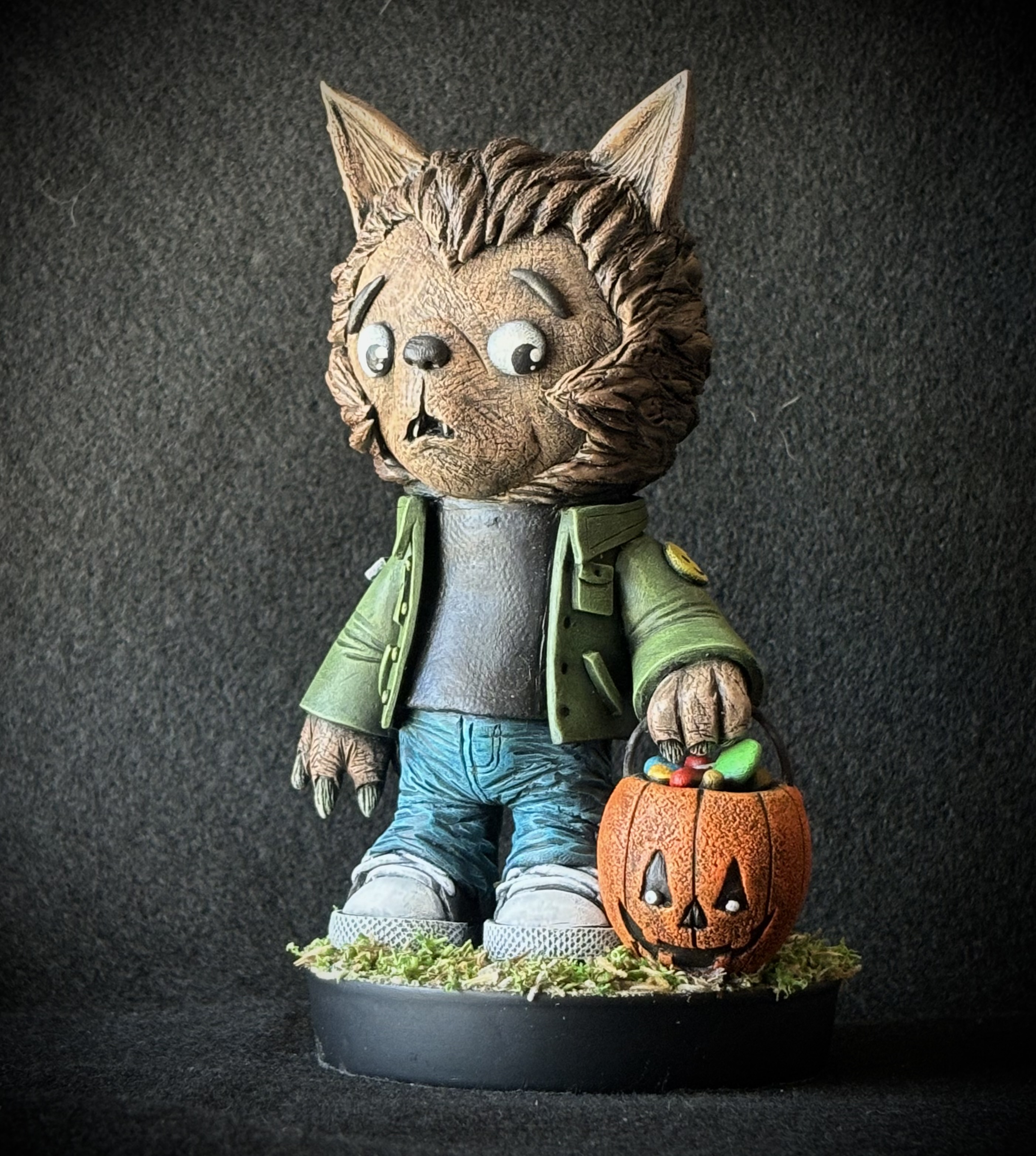 Meet “Lobito” he loves ripping human faces off and leaving torsos arm and legless. Oh and he also loves chomping on candies. Original sculpt made of polymer and 2part epoxy clay Sits on a resin base adorned with faux grass. 6.25 in.X 3.75 in.